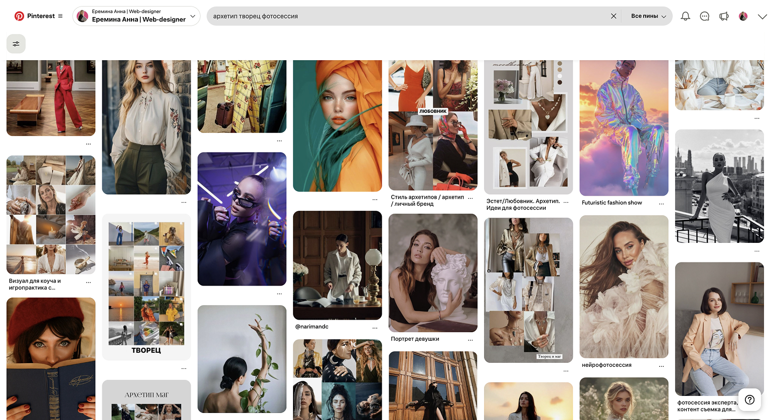 Когда вы определили свой архетип, следующий шаг — поиск визуальных идей, которые помогут сформировать стиль вашего будущего нейрофото. Один из самых удобных инструментов для этого — Pinterest. Это платформа, где собраны миллионы картинок, коллажей и готовых идей по стилю, образам, одежде, цветам и даже настроению снимка.